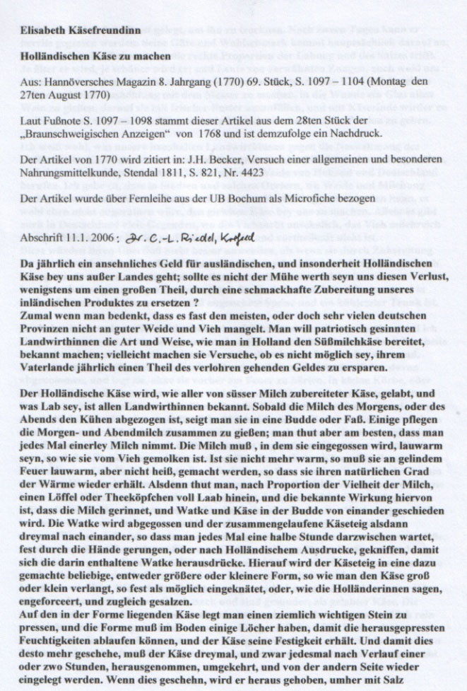 Elisabeth Käsefreundinn, "Holländischen Käse zu machen", aus Braunschweigischen Anzeigen