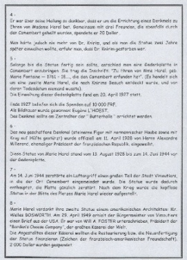 Diese Statue von Marie Harel wurde um 1949 von dem amerikanischen Architekten Mr. Welles Besworth entworfen und von dem französischen Bildhauer Maurice Lebeau geschaffen. Das Meisterwerk, 2,20 m hoch, wurde im Jahre 1953 beendet. Die Statue wurde aber erst nach einem "Käsekrieg" um die Bezeichnung des Denkmals im Jahre am 04.10.1956 errichtet.